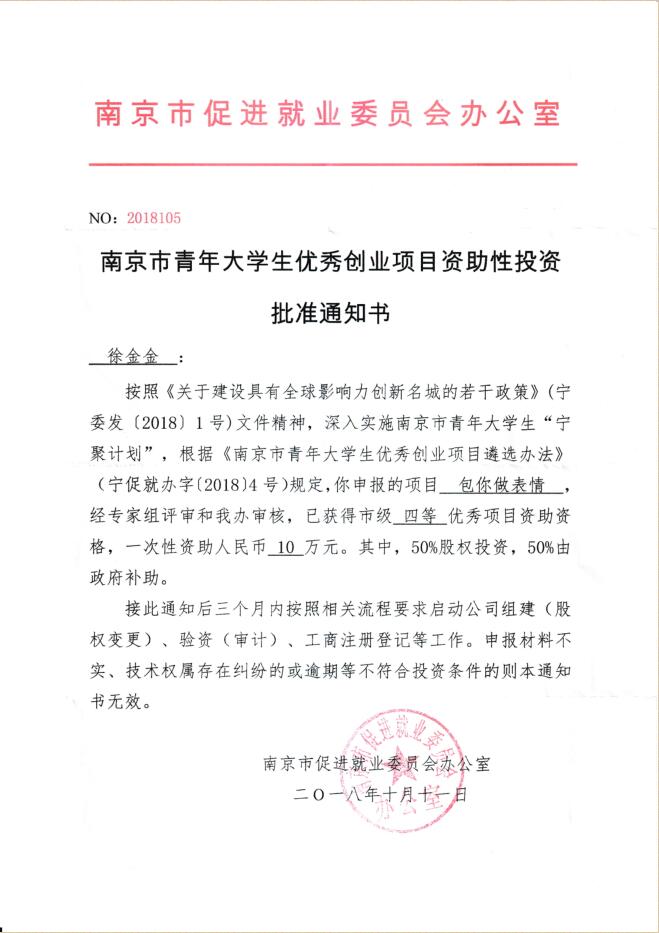 2018年10月11日,在南京市大学生优秀创业项目评比中,BB贝博艾弗森原官方网站学子徐金金、韦苗苗“依智科技”团队申报的“包你做表情”项目,被评为南京市大学生优秀创业项目,获得市级四等资助资格,一次性资助10万元。同时,该项目在中国高校计算机大赛(微信小程序应用开发赛)中获得华东赛区三等奖。