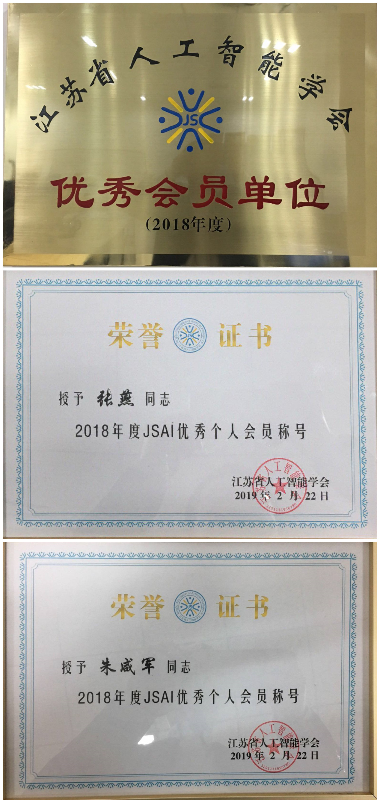 江苏省人工智能学会在《关于2018年度先进集体和个人的决定(苏智会【2018】9号)》中决定授予BB贝博艾弗森原官方网站为江苏省人工智能学会优秀会员单位(2018年度),授予张燕副校长和朱咸军博士为2018年度JSAI优秀个人会员称号,并授予2017级陈亭谕同学和郭孝斌同学为2018年度JSAI优秀志愿者称号。