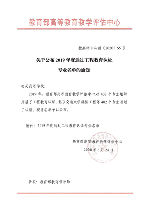近日,教育部高等教育教学评估中心、中国工程教育专业认证协会正式发布《关于公布2019年度通过工程教育认证专业名单的通知》(教高平中心函[2020]55号)和《关于公布北京交通大学机械工程等402个专业认证结论的通知》(工认协[2020]15号),公布了2019年度通过工程教育认证专业名单。贝博官网软件工程专业顺利通过工程教育专业认证,成为该专业通过认证的首批应用型高校。