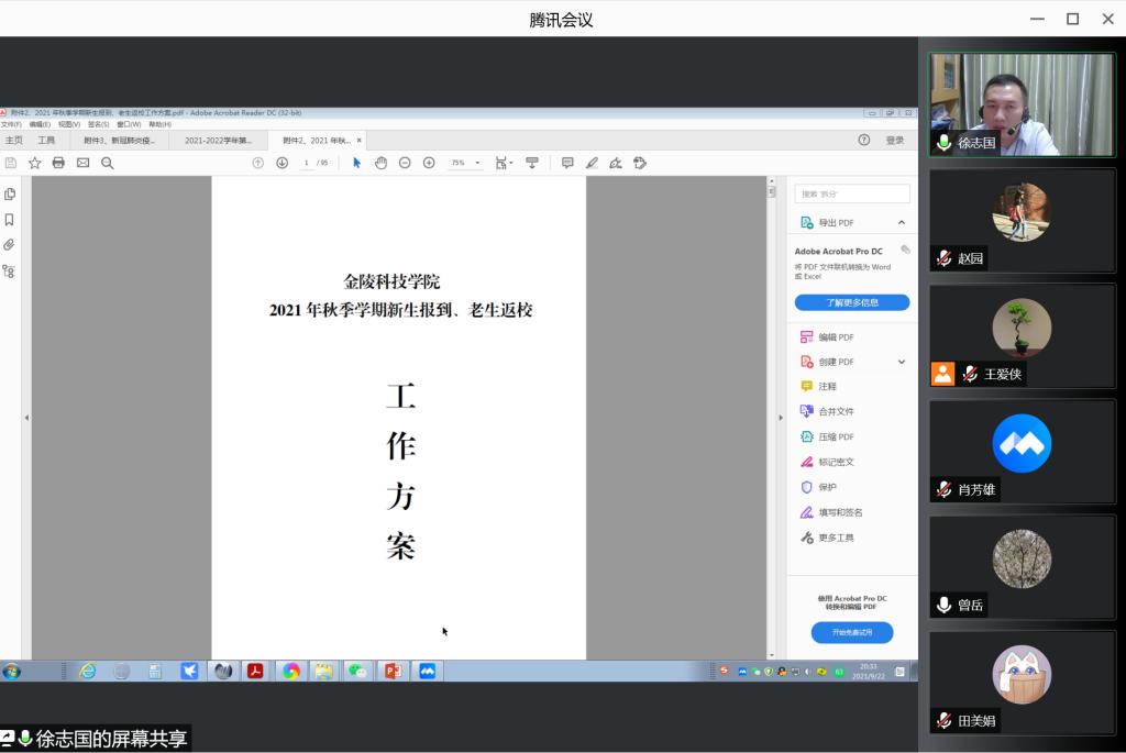 徐志国书记向全院教职工传达了上午学校2021年秋季学期新生报到、老生返校工作会议精神,并带领教职工学习了《高等学校新冠肺炎疫情防控技术方案》、《新冠肺炎疫情防控两案九制及其他配套制度》、《2021年秋季学期新生报到、老生返校工作方案》三个文件。强调了学院要把各项工作做细做实,牢筑疫情防控防线。