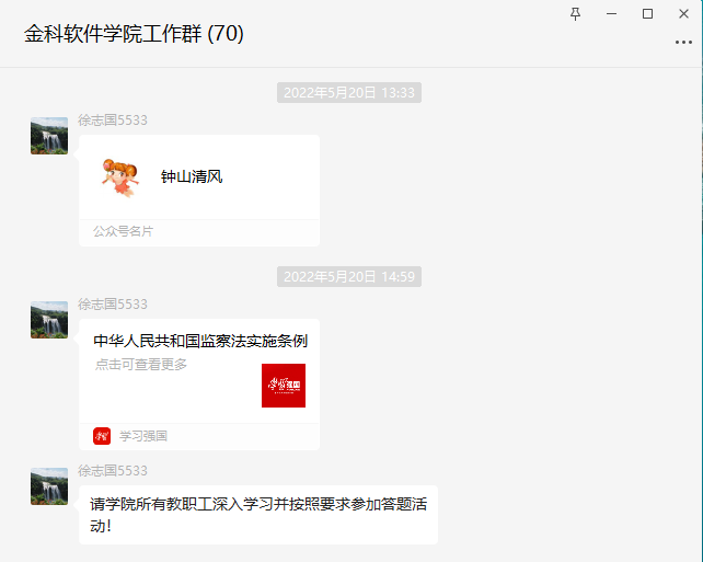 为深入学习贯彻习近平法治思想,落实宪法和监察法要求,推动全院教职工学好用好《中华人民共和国监察法实施条例》(以下简称《条例》),根据校纪委通知在全校范围内开展《条例》学习宣传活动的要求,5月20日,BB贝博艾弗森原官方网站积极组织动员全院教职工参加《中华人民共和国监察法实施条例》学习及线上答题活动。