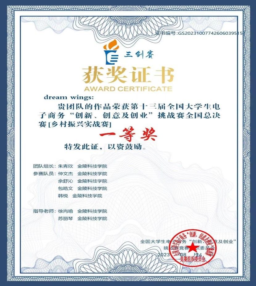 2023年3月,dream wings团队参加校内选拔赛,成功晋级路演答辩环节,最终获得“校赛一等奖”和“最佳创业奖”。6月,dream wings团队代表贝博官网在南京邮电大学参加江苏省省赛,成功斩获省赛一等奖。之后,dream wings团队不断打磨PPT与演讲稿,最终在7月dream wings团队代表学校参加全国总决赛,荣获全国一等奖。