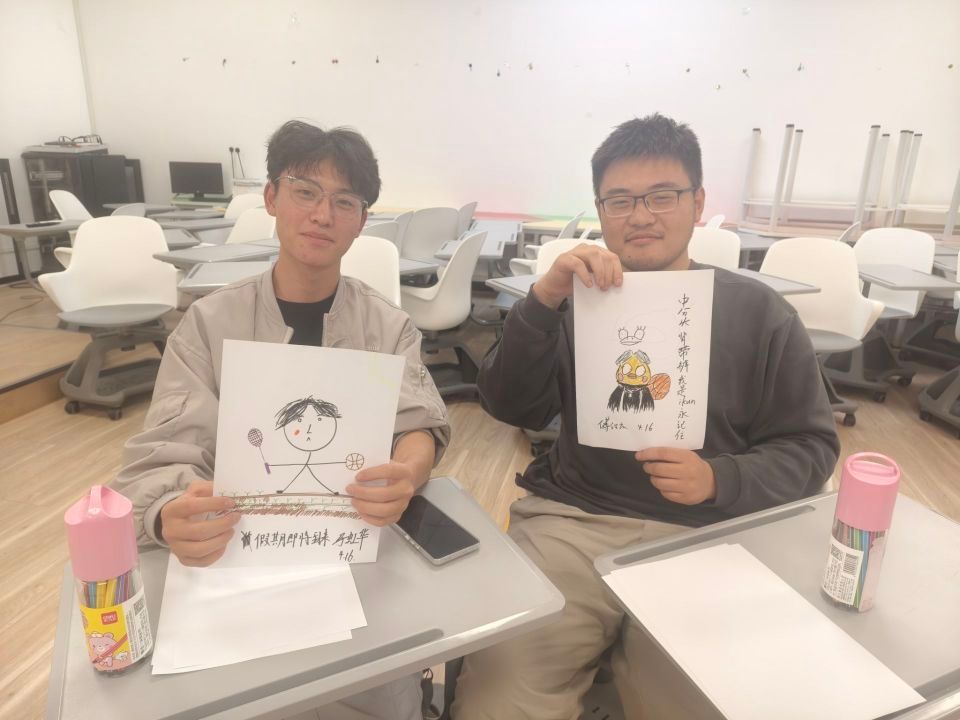 活动伊始,眭爱萍老师让同学们通过自画加强对自我的认知,同学们在老师的带领下很快沉浸于色彩的世界。在轻松的氛围中,大家手执画笔,或用明快色调描绘积极愿景,或通过细节刻画展现性格特质——有人以篮球球拍展现对运动的热爱,有人用华装彩服表现对美的追求,每幅作品都成为个体生命故事的独特注脚。心灵自画不仅能拉近与同学的距离,还能提升心理服务的实效性和亲和力。