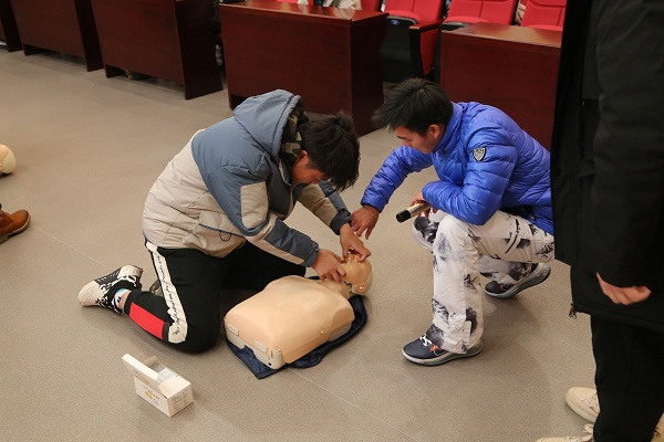 孙浩老师先从红十字应急救护、救护原则、救护程序、应急救护的注意事项、救护员的心理调整和能力评估等五个方面对突发安全事件应该如何面对、处理向同学们进行了详细地讲解;接着又系统地讲解了心肺的心理结构和复苏法的操作要领。讲座结束后,在孙浩老师张理航老师和孙垒老师的细心指导下,同学现场进行模拟心肺复苏实操练习。