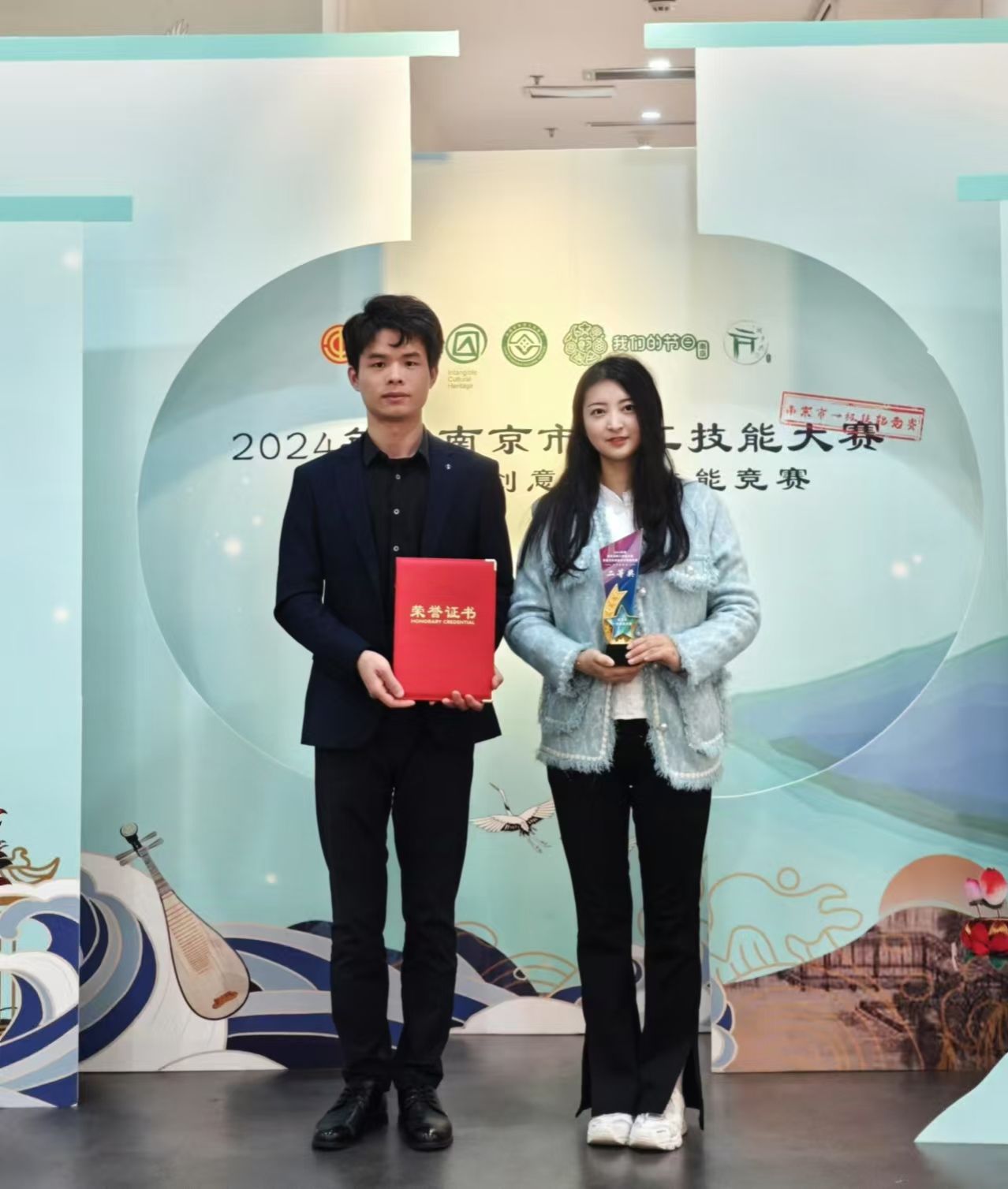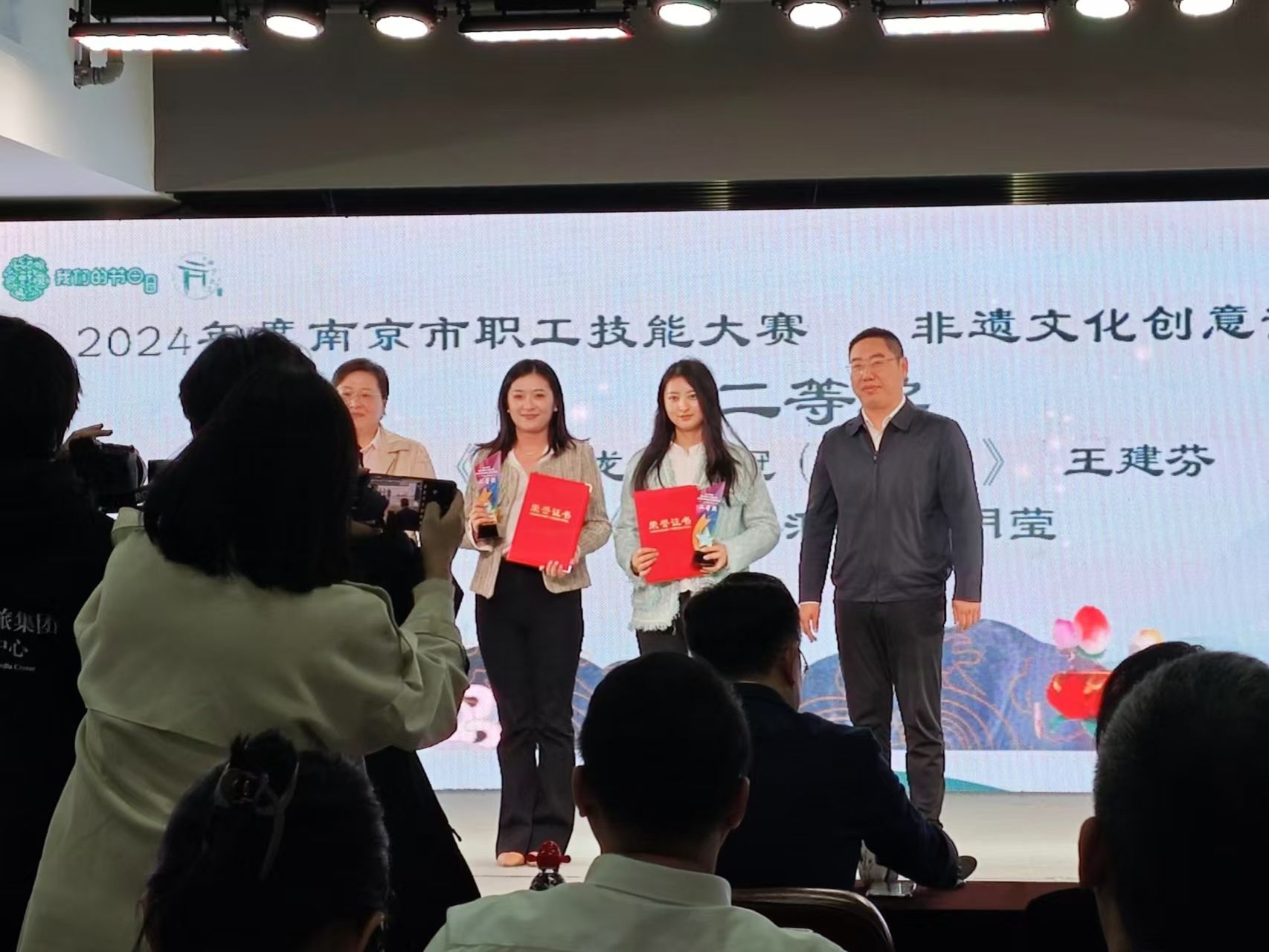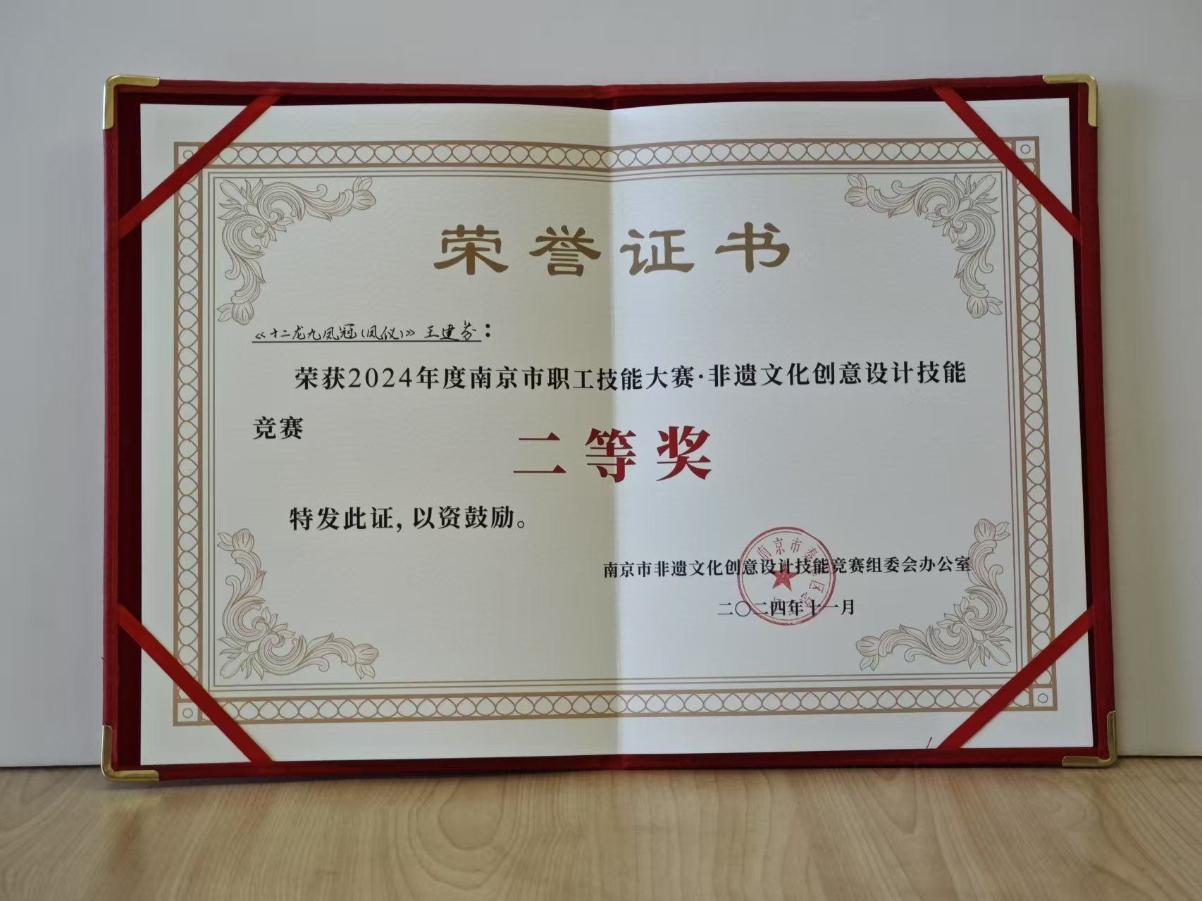 2024年度南京市职工技能大赛非遗文化创意设计技能竞赛,决赛于2024年11月8号举行,来自BB贝博艾弗森原官方网站的 “三生令原创国风发冠”项目,通过初赛、复赛的激烈角逐,进入到决赛,品牌创始人马永强、王建芬携带原创产品非遗点翠复原款“十二龙九凤冠(凤仪)”参加决赛,荣获二等奖。
